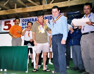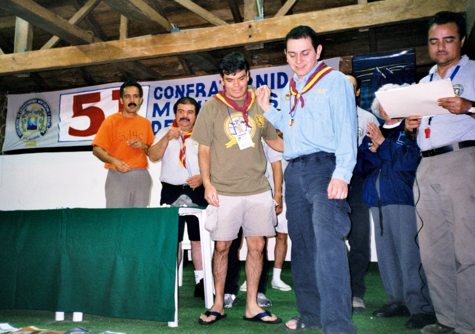 Confraternidad Nevado de Colima, 3-Feb-2005, Víctor Campos entrega a nuestro Capitán Julio Hdz. la medalla por asistir a tres Confraternidades consecutivas, Preside el Acto Alfredo Velázquez.