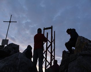 14-Mzo-2020, Continúan los trabajos de ascenso de las partes del cuerpo de la cruz, siempre con el mejor de los ánimos.