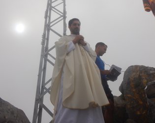 El Padre montañista Alejandro Beltrán Garza oficiando la misa al pie de la cruz, asistido por el padre Guillermo Camilo Karam.